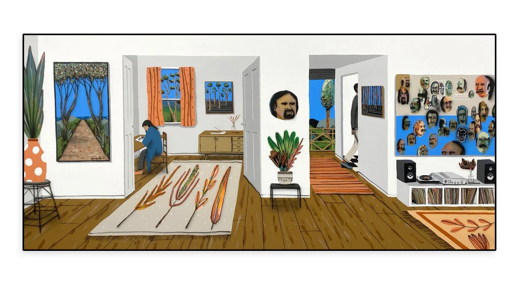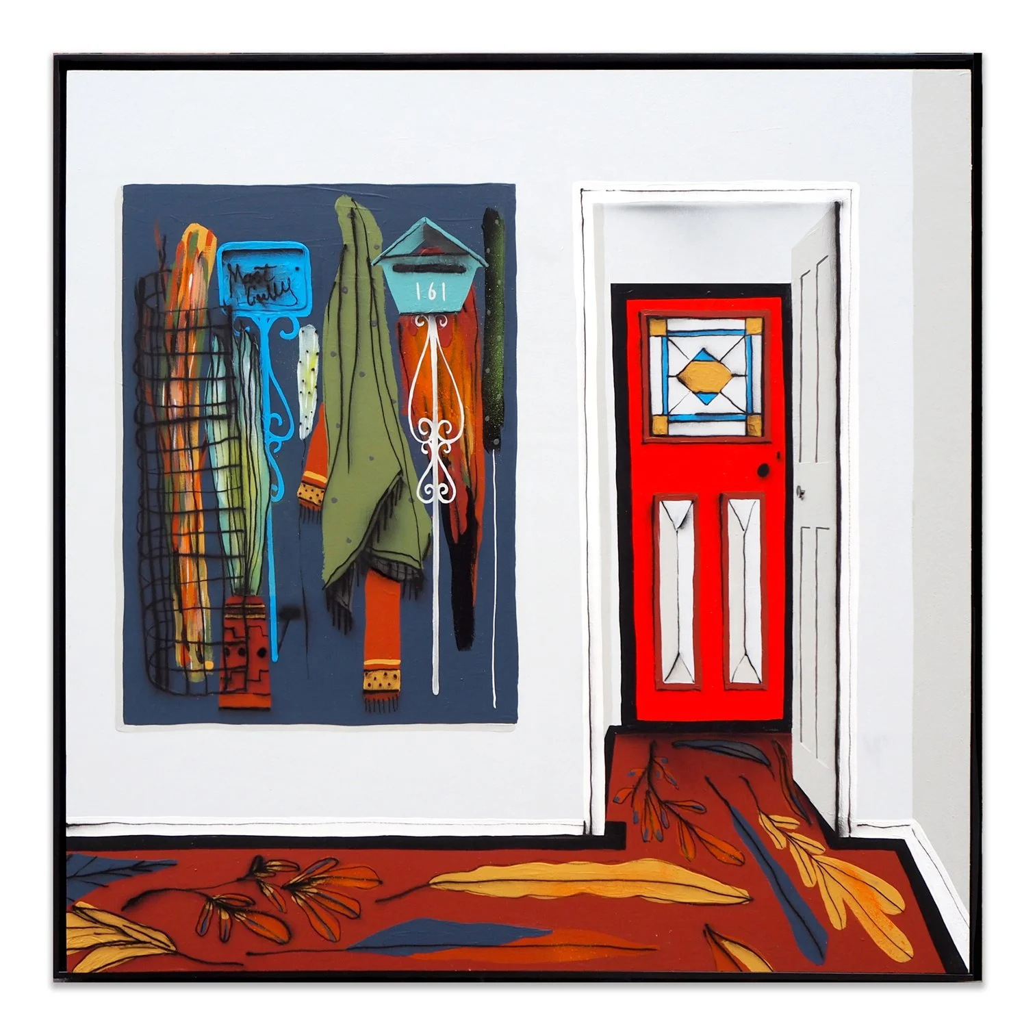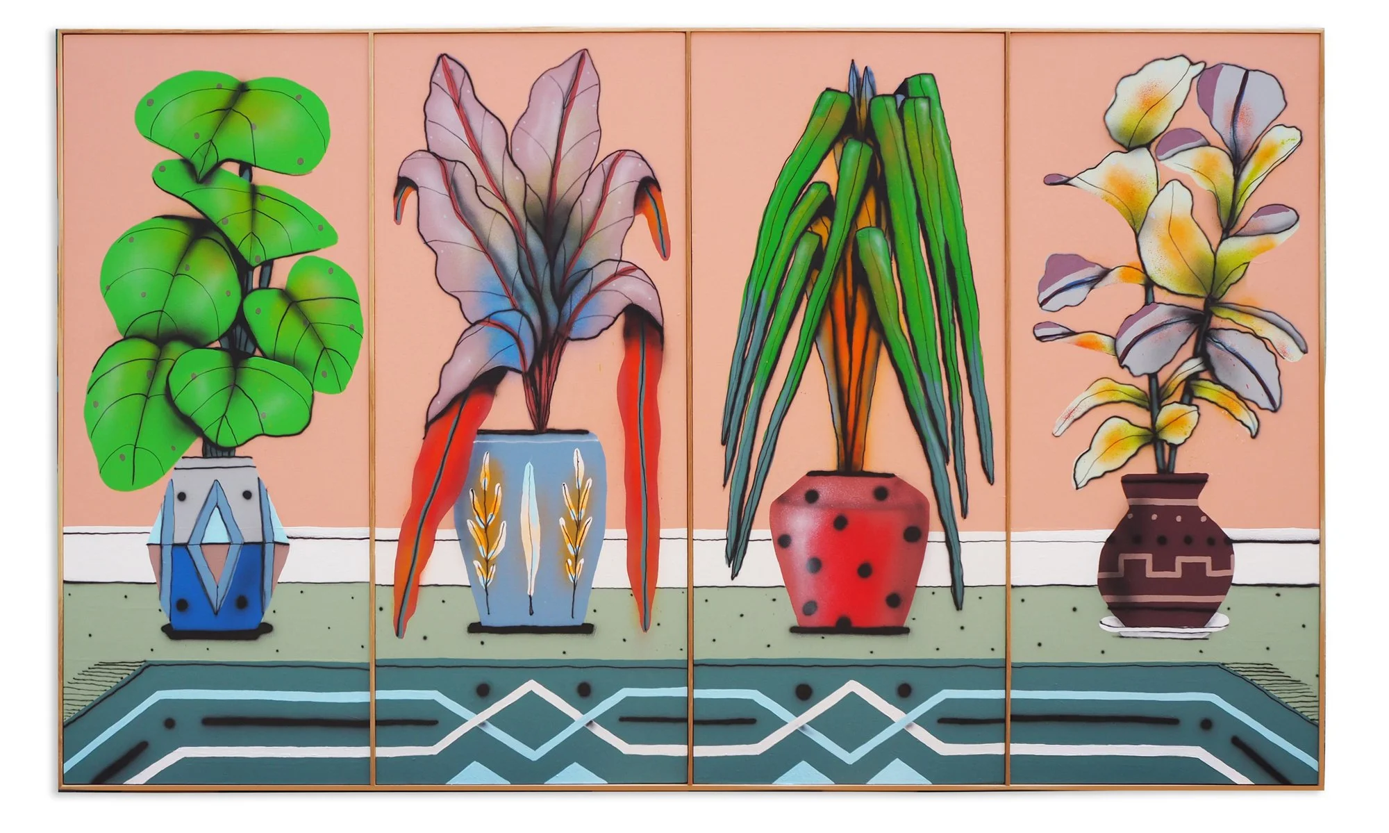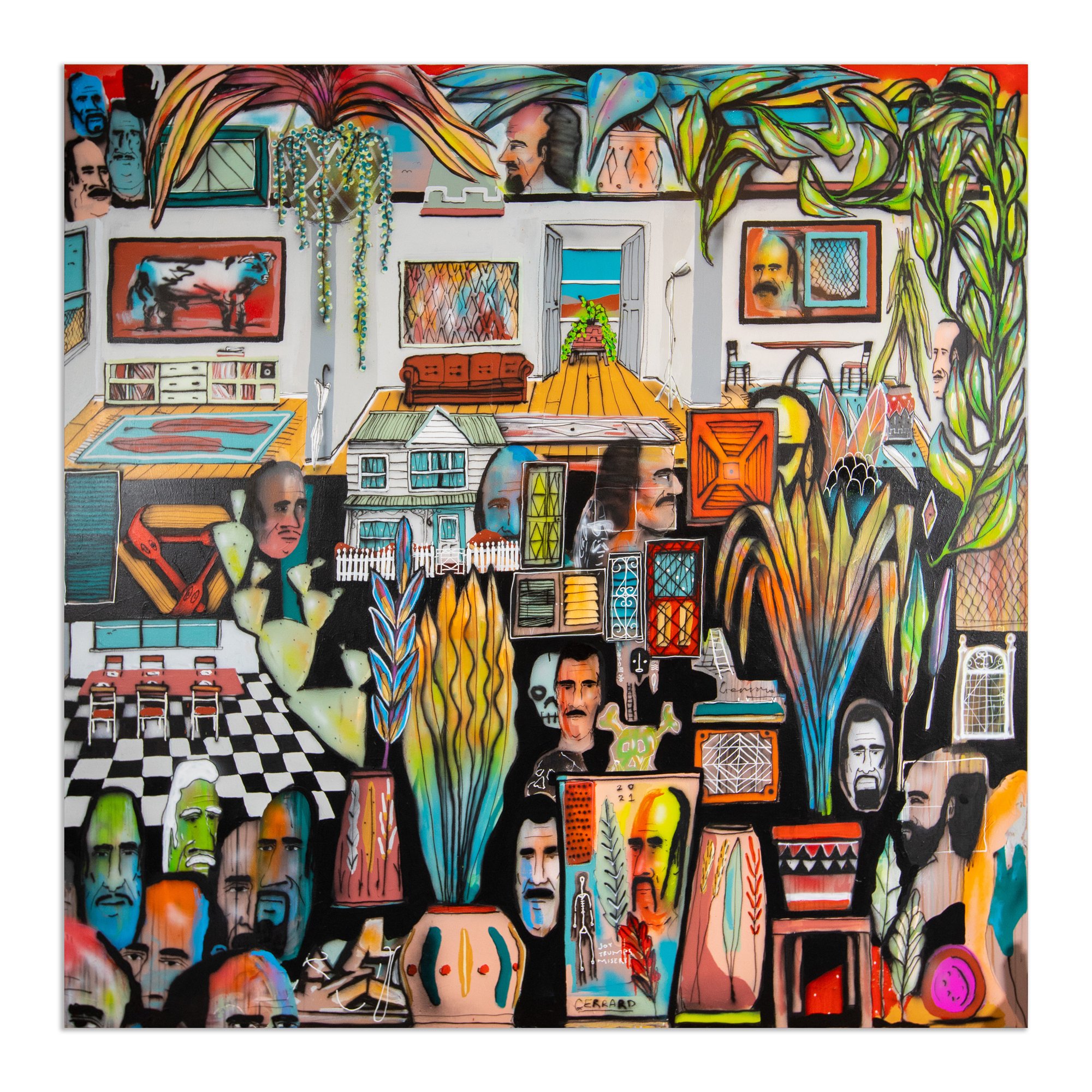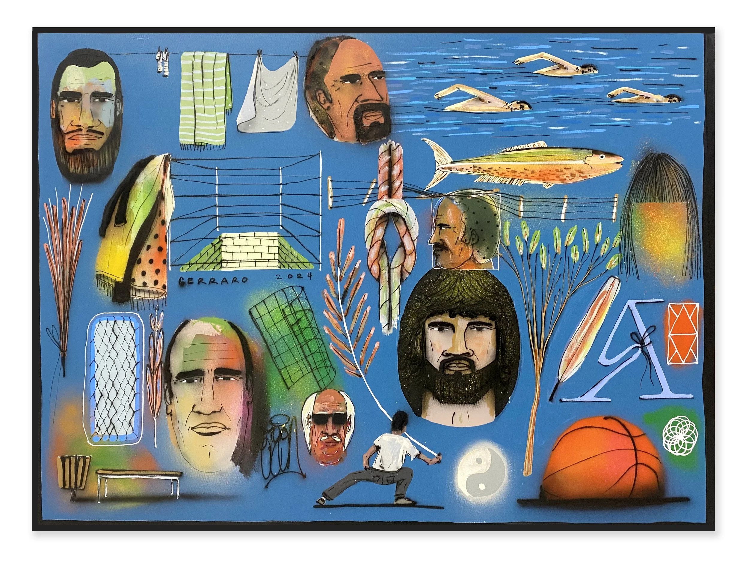 Synthetic polymer, airbrush and spray paint on framed artist board